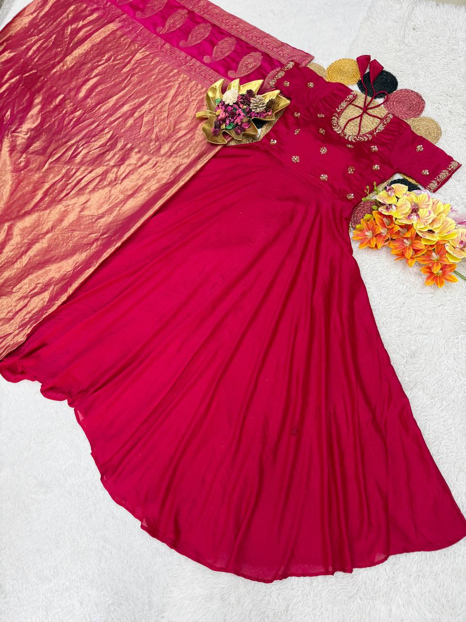 Imagine stepping into a festive gathering, the air filled with excitement and joyful chatter. You stand out with a stunning gown that radiates elegance and charm. The Beautiful Maggam Work Gown with Tissue Dupatta is designed to enhance your festive experience, ensuring that you not only look beautiful but feel confident and stylish.