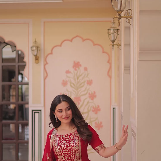 Step into the spotlight with our premium designer ready-made gown collection, where elegance meets convenience. This brings you a gown crafted from faux blooming fabric, adorned with intricate embroidery, zari, and sequin work. Available in two stunning colors: red and rama (teal), this gown is designed to make you feel like royalty at any event.