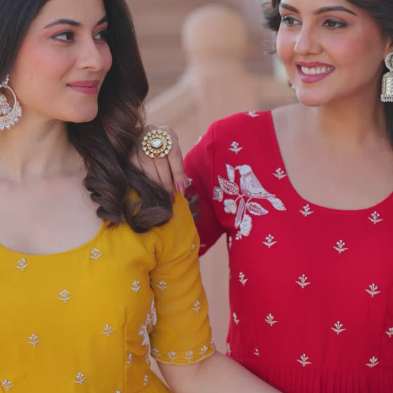 Indulge in the allure of our premium designer readymade gown, crafted for those who appreciate effortless elegance and exquisite design. This gown promises to make you the radiant centerpiece of any special occasion. Available in vibrant Red and Yellow, it's designed to flatter and captivate.