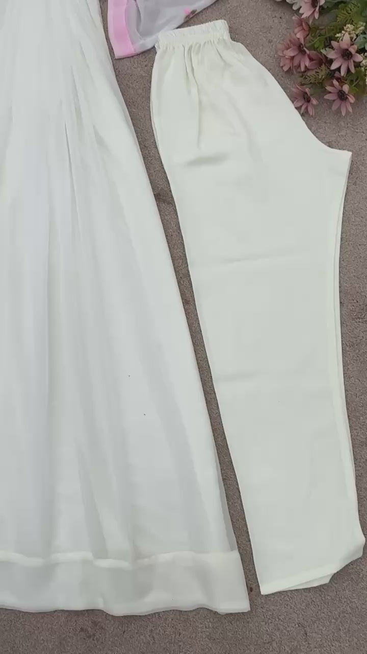 • Stunning Dupatta: Heavy Georgette with digital floral prints and embroidered sequence work; finished with a pastel pink border and oversized flower motifs for maximum impact.