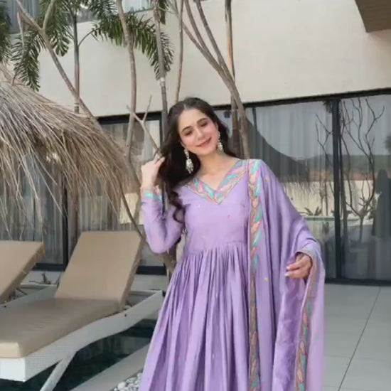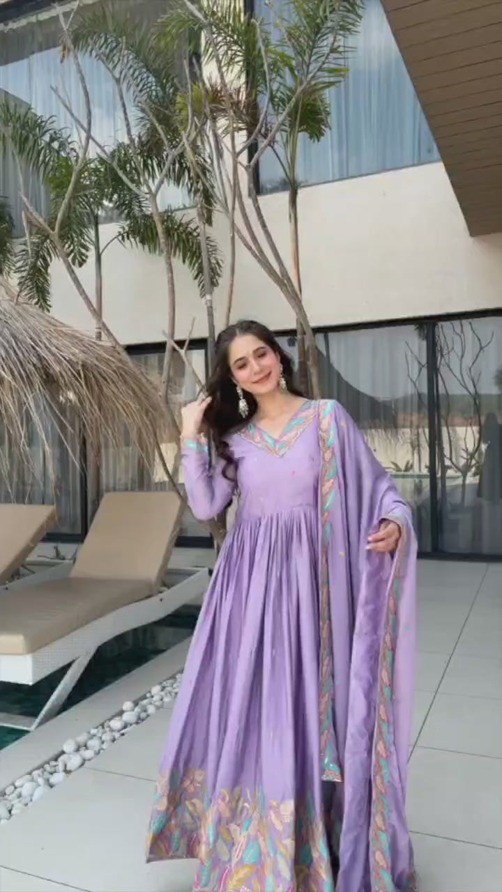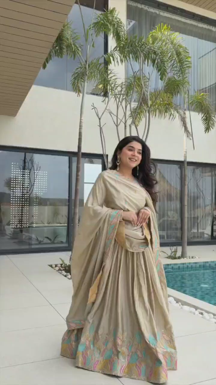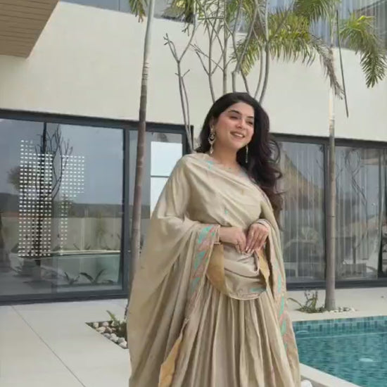 Blending Western silhouette charm with rich Indian artistry, this ready-to-wear set makes you the center of attention. Its Chinnon fabric flows beautifully, while the intricate sequins and multicolor thread embroidery create instant visual drama – no image needed to imagine the sophisticated sparkle and graceful movement.