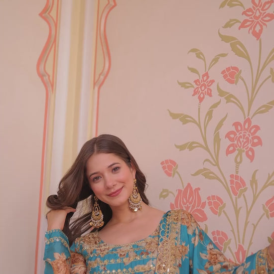 * Floral Teal: A beautiful teal base featuring delicate floral digital prints and golden embroidered sequins.