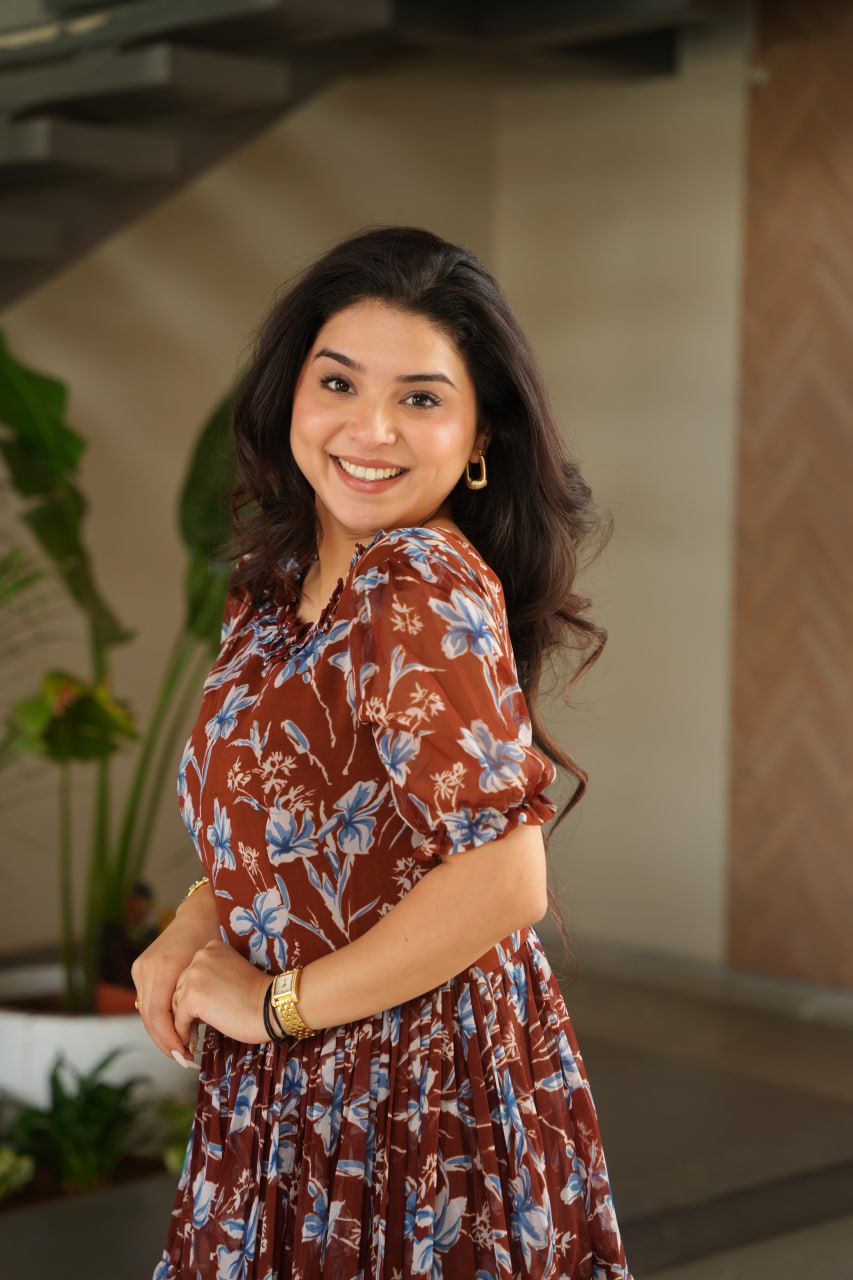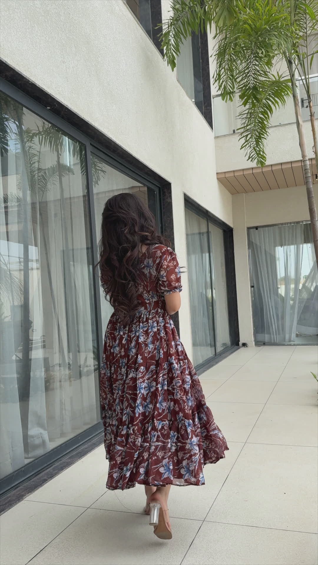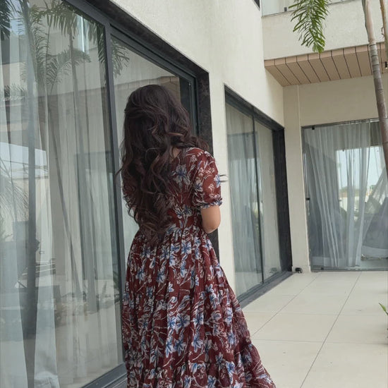 Step out in effortless style with our exquisite Graceful Bloom Gown, a perfect blend of comfort and elegance. Crafted from premium faux georgette fabric, this gown features a captivating floral print that exudes timeless charm, reminiscent of traditional Kalamkari artistry. The rich brown hue, adorned with delicate blue and white floral motifs, creates a stunning visual appeal.