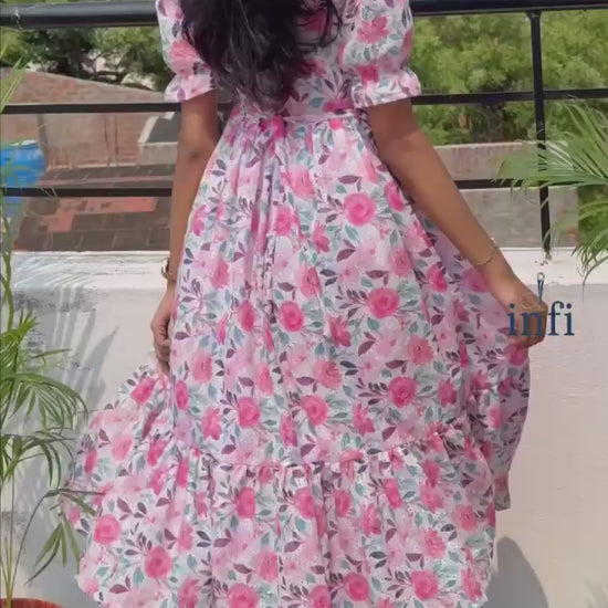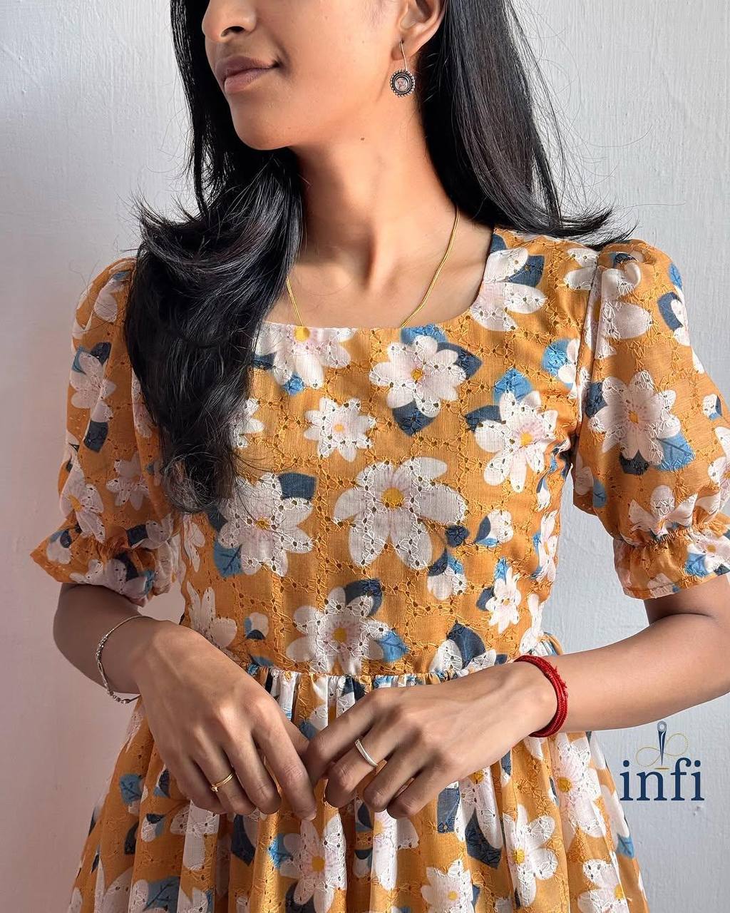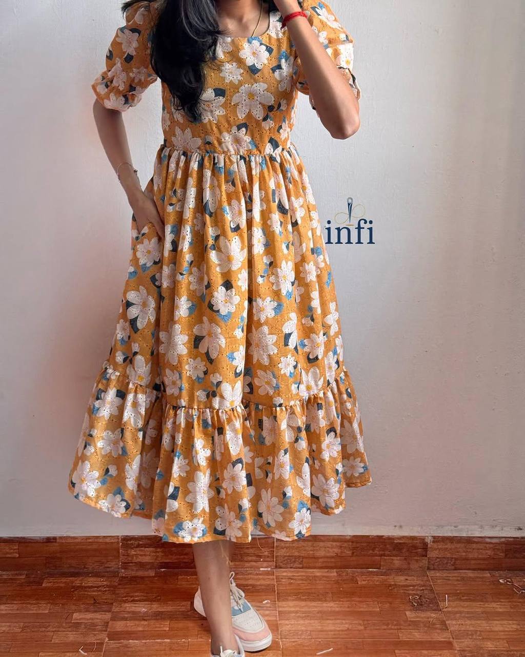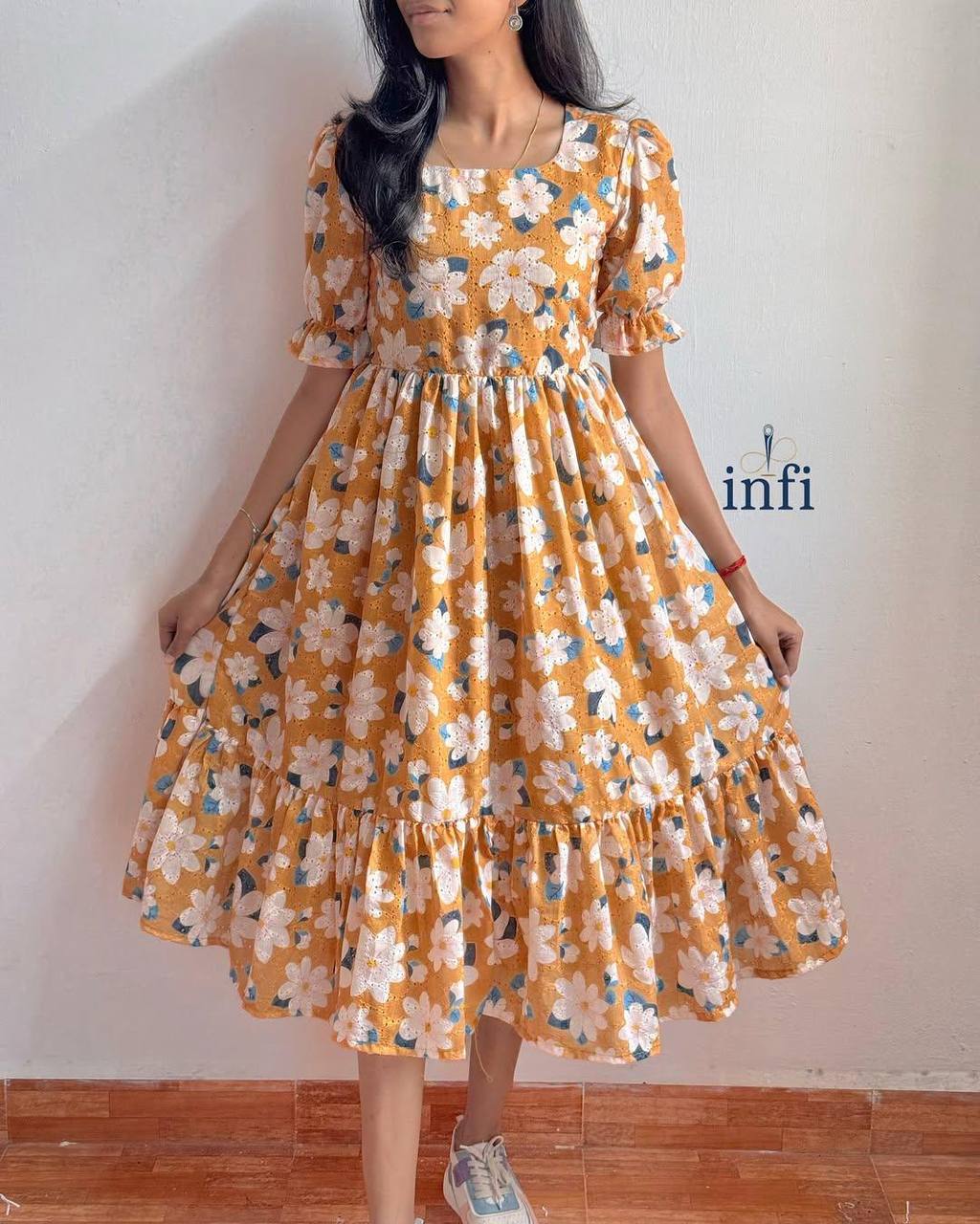 Embrace effortless elegance with this beautiful floral midi dress. Featuring a delightful sunflower-inspired print with delicate white and blue blossoms against a warm orange backdrop, this dress is perfect for adding a touch of charm to any occasion. The dress boasts short sleeves with a subtle puff, a comfortable round neckline, and a flattering silhouette that flows to a graceful 48-inch length. It's designed with complete lining for a smooth feel and features a tie detail at the waist to accentuate your figure. Crafted from comfortable "Football" material, this lightweight dress (approximately 480 grams) offers both style and ease of wear.