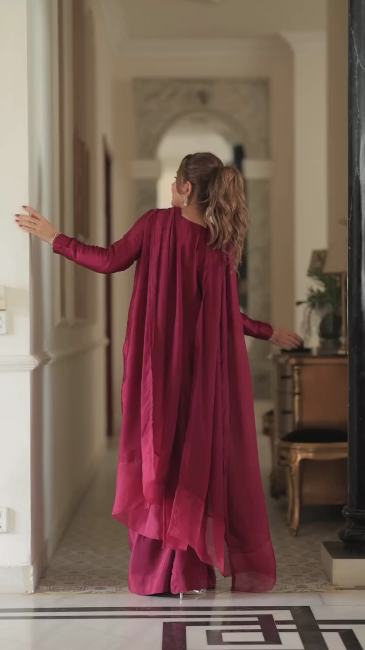 Embrace timeless elegance with the Sarara Chic ensemble, a Rangbhoomi creation designed for unforgettable celebrations. This exquisite party wear set features a beautifully embroidered top, a flowing sarara bottom, and a delicate dupatta, ensuring you make a sophisticated statement at every event. Picture yourself radiating confidence and grace, turning heads with your impeccable style.