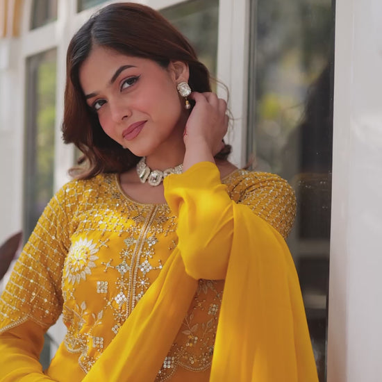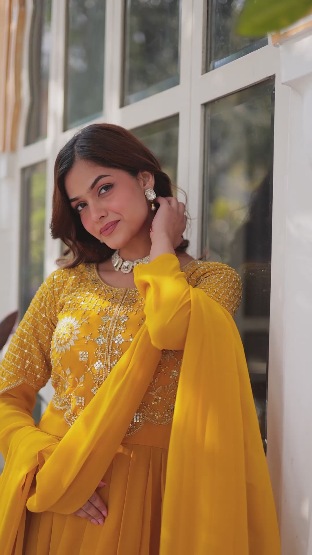 Step into elegance with this stunning readymade gown and dupatta set from Rangbhoomi. Crafted from flowing faux blooming georgette, the gown features attractive embroidery and a comfortable cotton lining. This full-sleeved design boasts a flattering round neck and a generous 3.5-meter flair, reaching a length of 56 inches. The set includes a matching faux blooming georgette dupatta with border detailing (2.25 meters). Available in two beautiful colors.