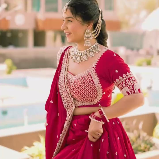 Step into the spotlight with this breathtaking red lehenga choli, designed for unforgettable festive moments. The intricate embroidery and graceful silhouette ensure you'll capture every eye. Feel the luxurious fabric and revel in the vibrant details that make this outfit a true masterpiece.